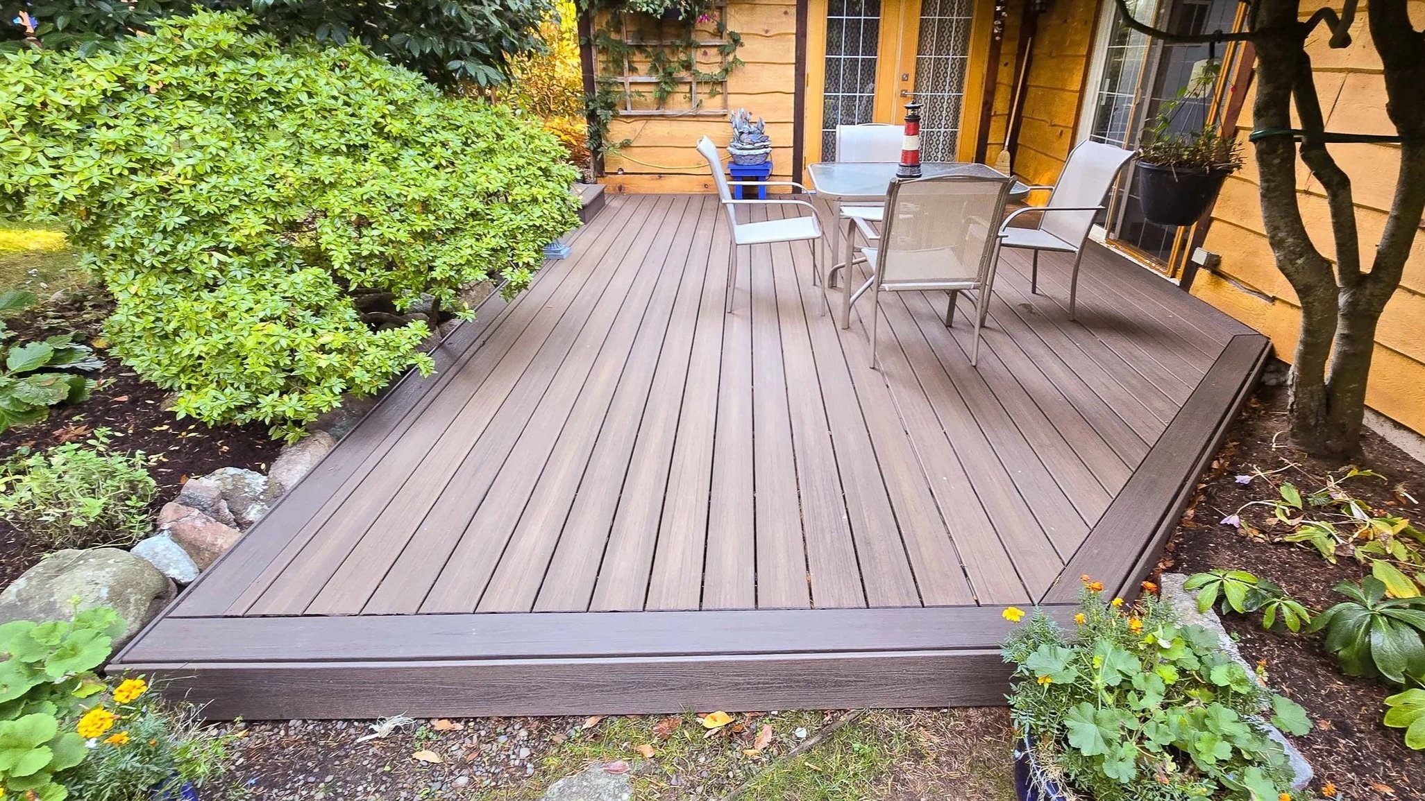 A composite deck was recommended to extend the lifespan and reduce future maintenance such as staining and cleaning. Joist tape was also utilized across all horizontal frame surfaces to slow moisture ingress and prevent premature rot.